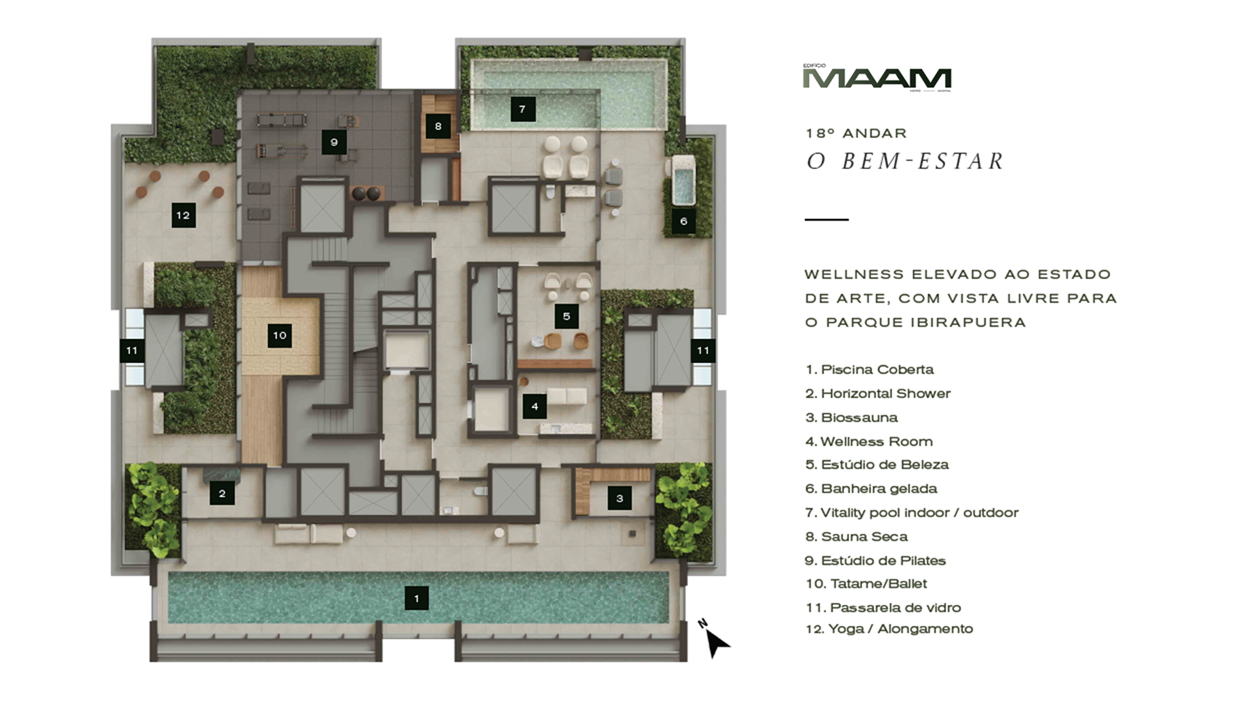 Desfrute de área de lazer sofisticada com wellness, bosque privativo, piscinas, spa, academia, quadra de tênis, coworking e muito mais.